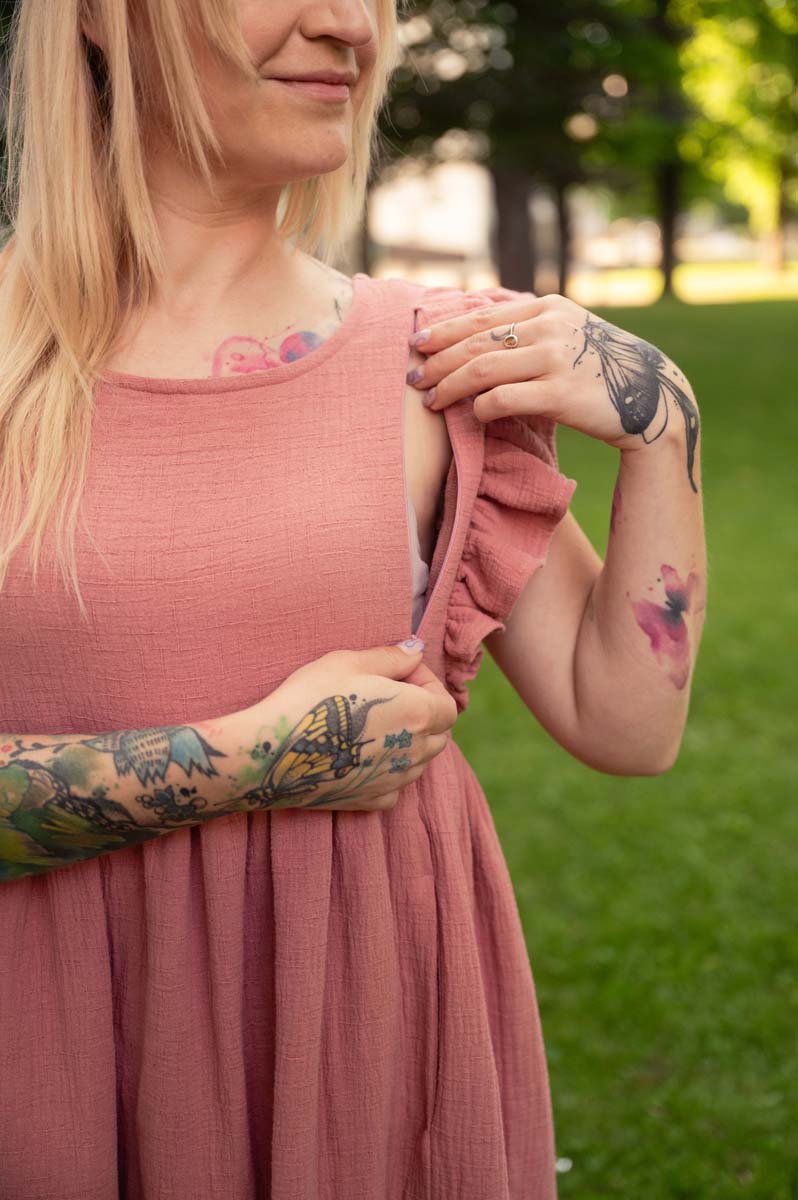 Romantické šaty na dojčenie Sára, sú vhodné na akúkoľvek príležitosť. Či už sa idete prejsť do mesta, na zmrzlinu, alebo sa vyberiete na rodinnú oslavu či dovolenku, budú neodmysliteľnou súčasťou vašich letných dní. Sú ušité z tej najjemnejšej viskózy, podšité bavlnou. Zipsy priamo pod prsiami zabezpečia jednoduché a veľmi komfortné dojčenie vášho bábätka. Zvončekový strih rukávov dokonale dopĺňa celkový vzhľad týchto jedinečných šiat.