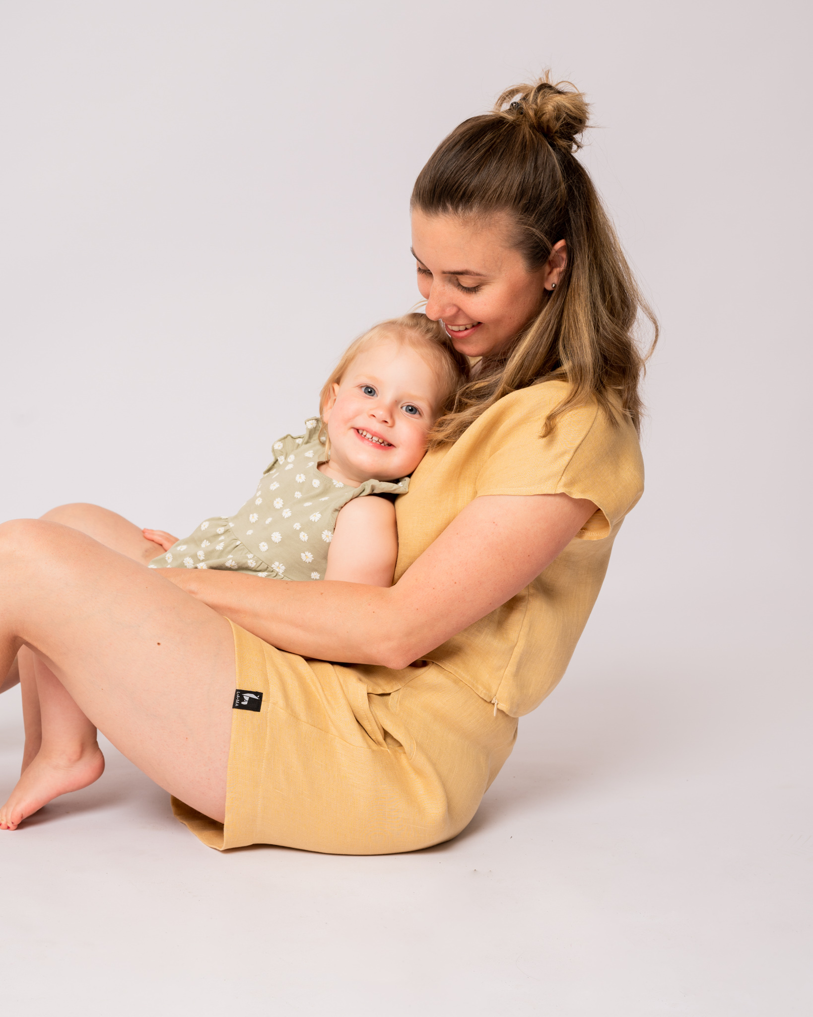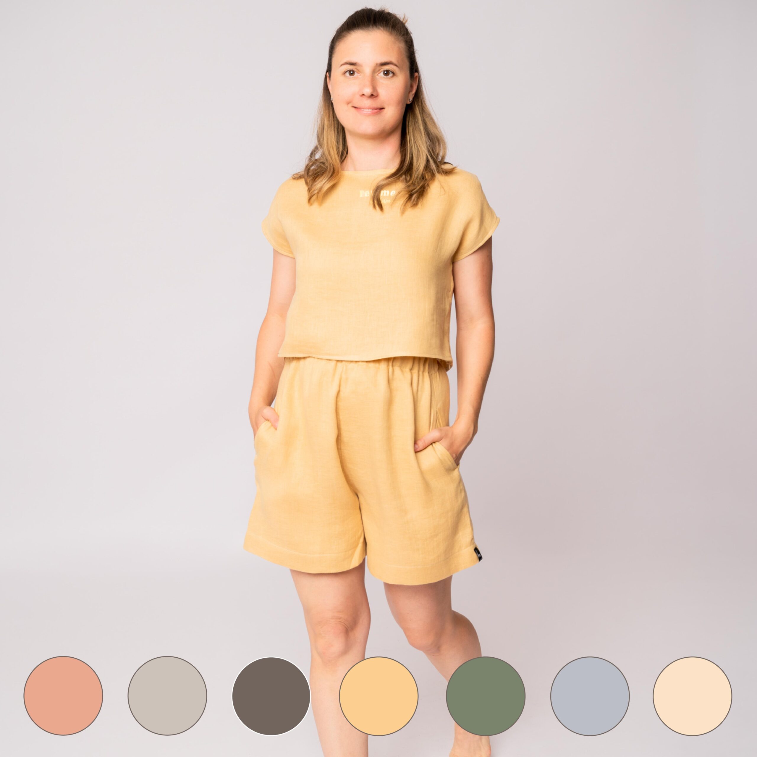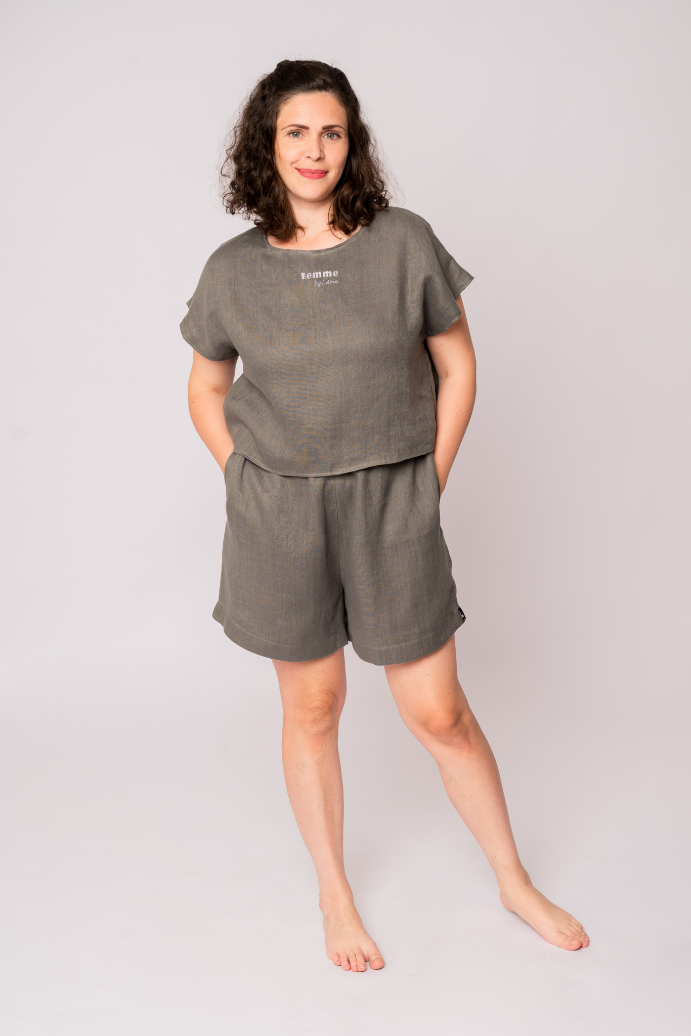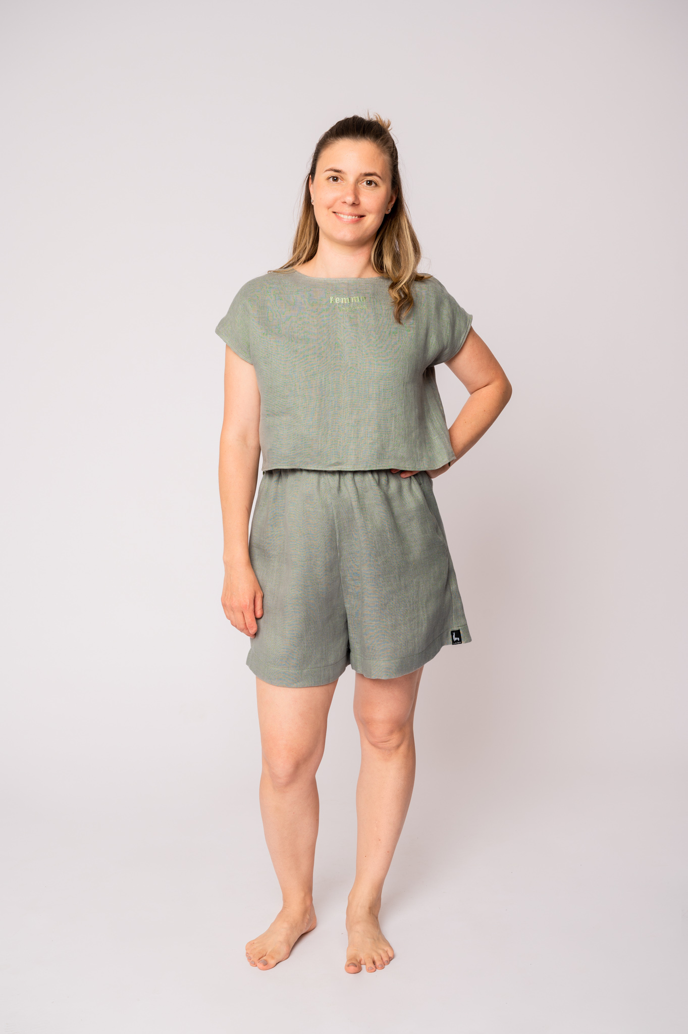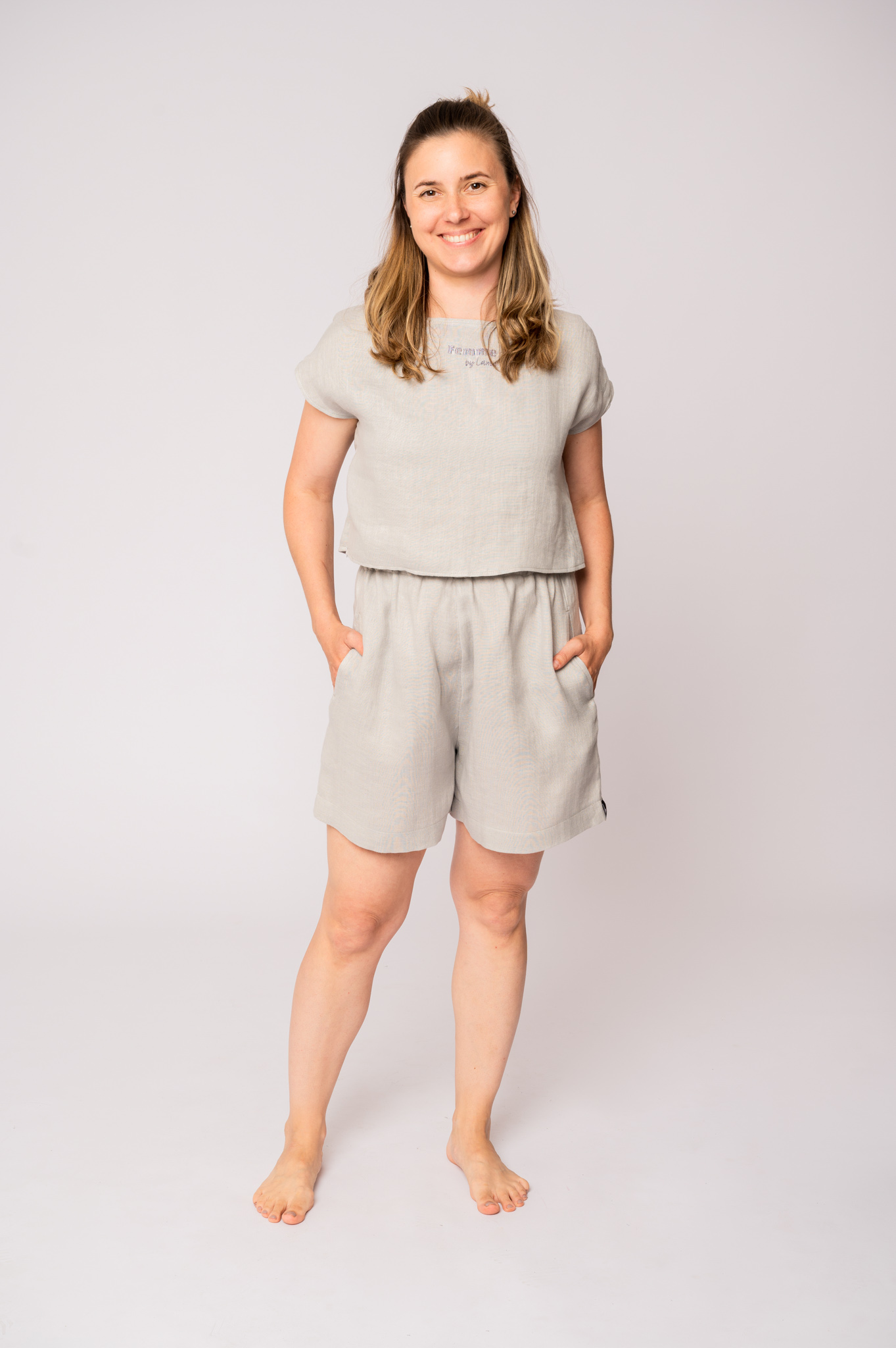 Kraťasy s vysokým pásom a k tomu štýlový Croptop. Tento set vyrobený z predpraného ľanu bude v lete vašou druhou kožou. Výhody ľanu asi nemusíme spomínať… ale predsa aspoň zopár z nich. Ľan je prírodný materiál, je antibakteriálny, ľahký, vzdušný a príjemne chladí. Tento materiál dokonale doplnil našu rodinu udržateľných materiálov v novej kolekcii Femme by Lama. Croptop sme vyšperkovali o jedinečnú výšivku na hrudi a pre pohodlné dojčenie aj krytými zipsami pod pazuchami. Kraťasy sú ušité v pohodlnom, voľnom strihu.